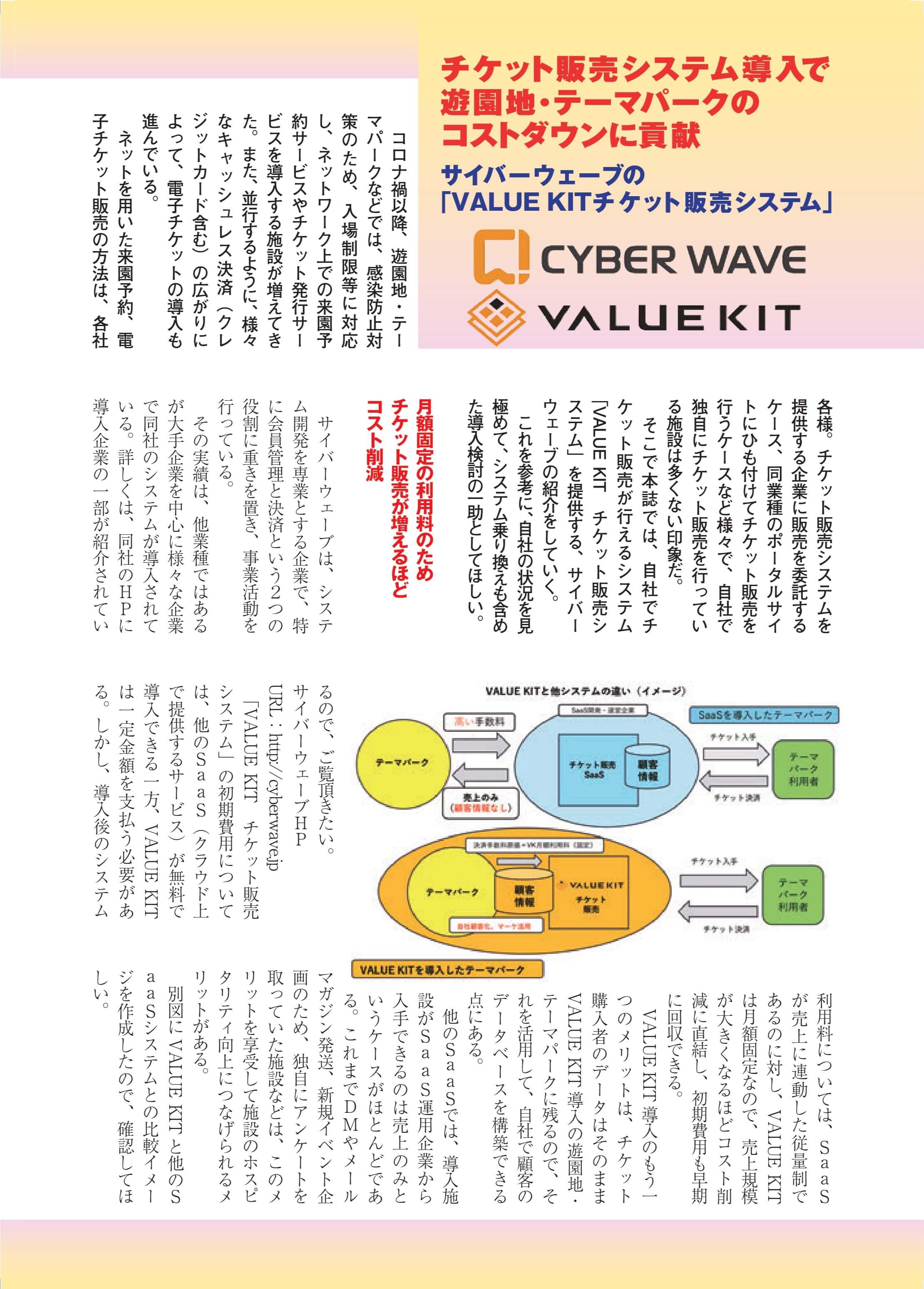 この度、サイバーウェーブの新プロダクト「VALUE KITチケット販売」が『月刊アミューズメント産業 2025年5月号』に掲載されました。月刊アミューズメント産業は、株式会社アミューズメント産業出版が発行しているアミューズメント施設やレジャー施設などの関係者に向けた業界紙です。業界のイベントや展示会、アーケードゲームの最新情報などを30年以上に渡って発信されています。