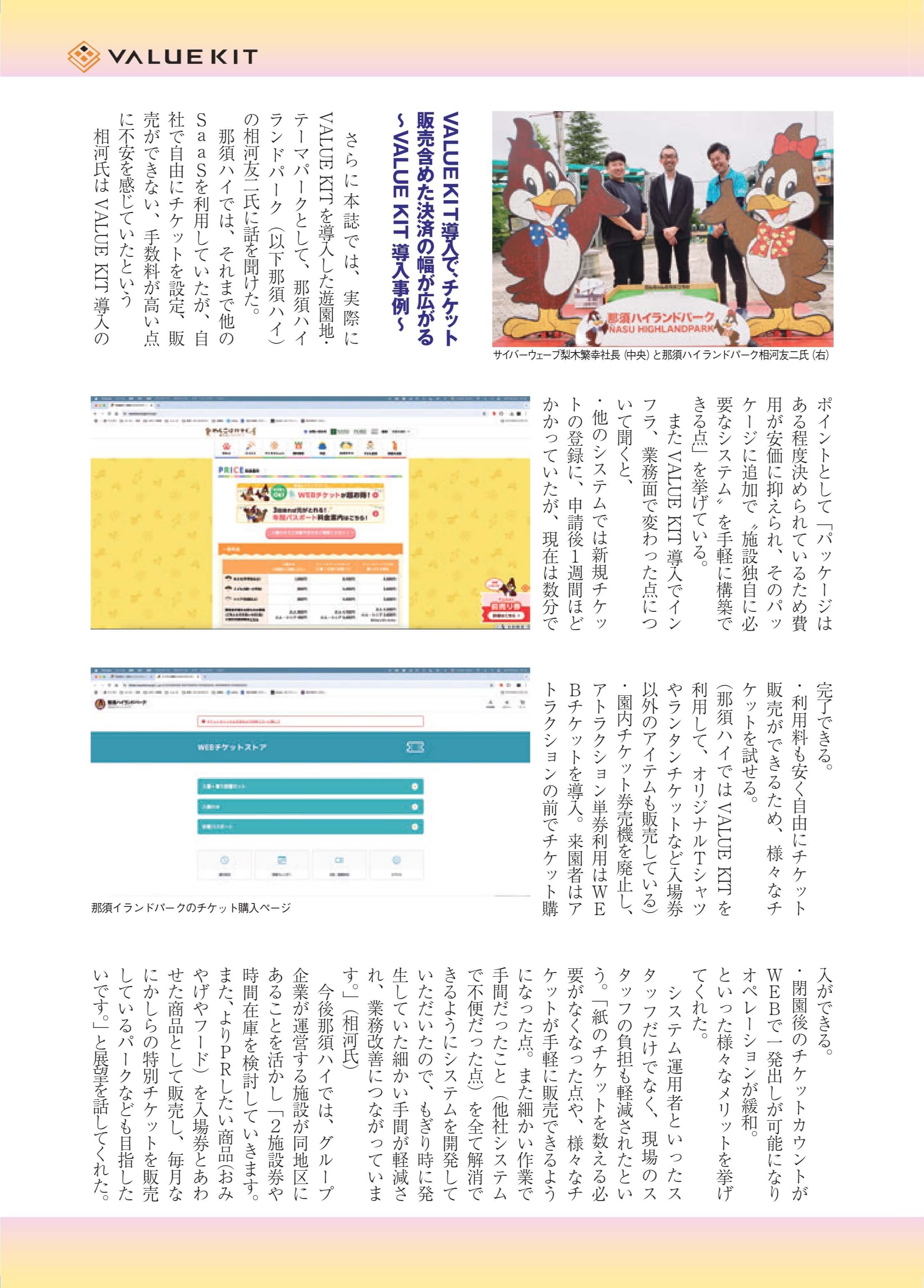 今回の記事は、サイバーウェーブ代表の梨木と那須ハイランドパークのチケット販売を担当されている相河氏へのインタビューを通して、VALUE KITを導入する際の費用やシステム管理者として感じたメリット、オペレーションがどのくらい緩和されたかなどの現場の声が伝わる内容となっております。下記が一部抜粋した内容となります。
